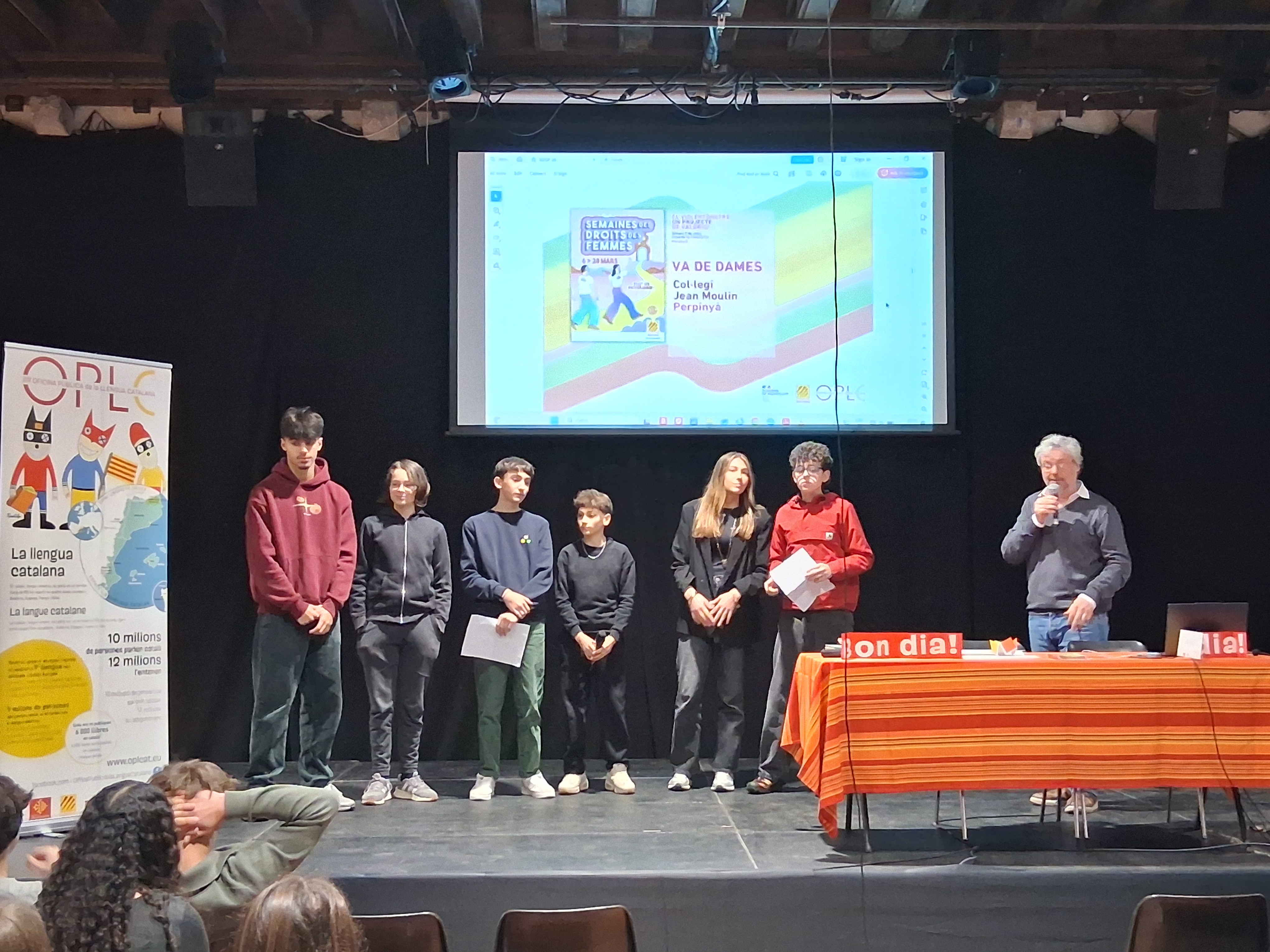 Ce lundi 9 mars, dans le cadre de la Journée catalane des droits des femmes, organisée par l’Office public de la langue catalane, et devant une centaine de personnes, les élèves de 3e bilingue catalan ont présenté deux projets réalisés en classe durant le mois de février.